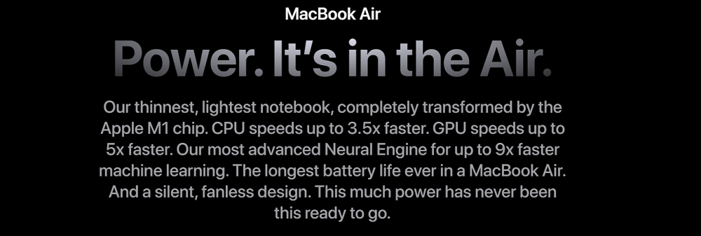 MacBook Air (M1), dòng sản phẩm mỏng nhất, nhẹ nhất trong dòng Mac của Apple, nay được trang bị chip M1 mạnh mẽ phát triển bởi chính Apple Silicon.