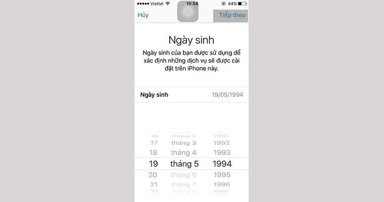 Bước 4: Chọn ngày tháng năm sinh rồi nhấn Tiếp theo