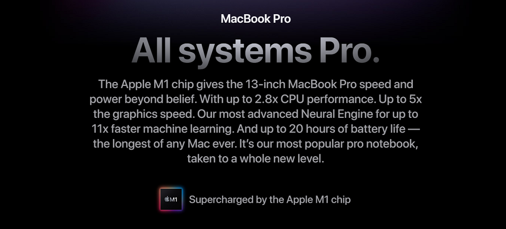 Macbook Pro được tích hợp vi xử lý M1 giúp cho chiếc MacBook xử lý nhanh hơn bao giờ hết. Bên cạnh đó là vi xử lý 8 lõi cực kì mạnh mẽ 4 lõi hiệu năng cao của Apple M1 là 4 lõi CPU nhanh nhất thế giới đối với dòng chip sử dụng năng lượng thấp.